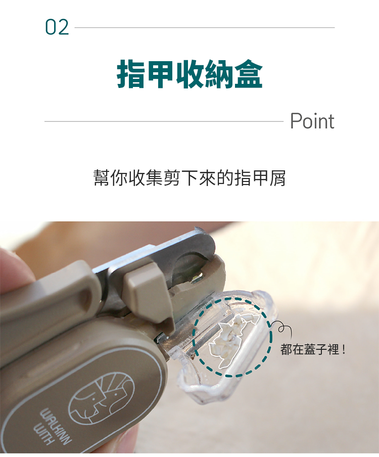 圓弧刀刃剪指甲俐落省力,附收納盒收集指甲屑,指甲屑不會散落滿地。