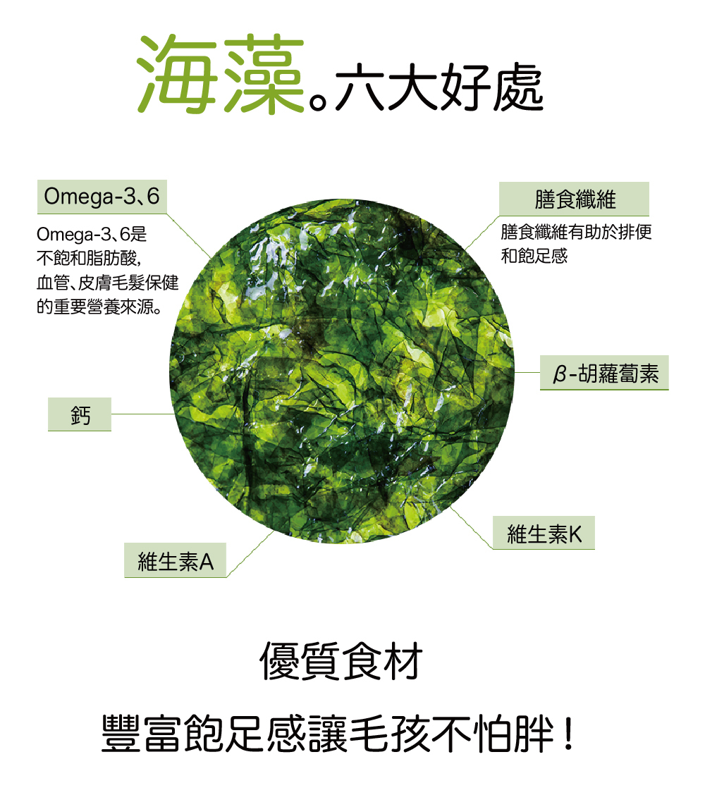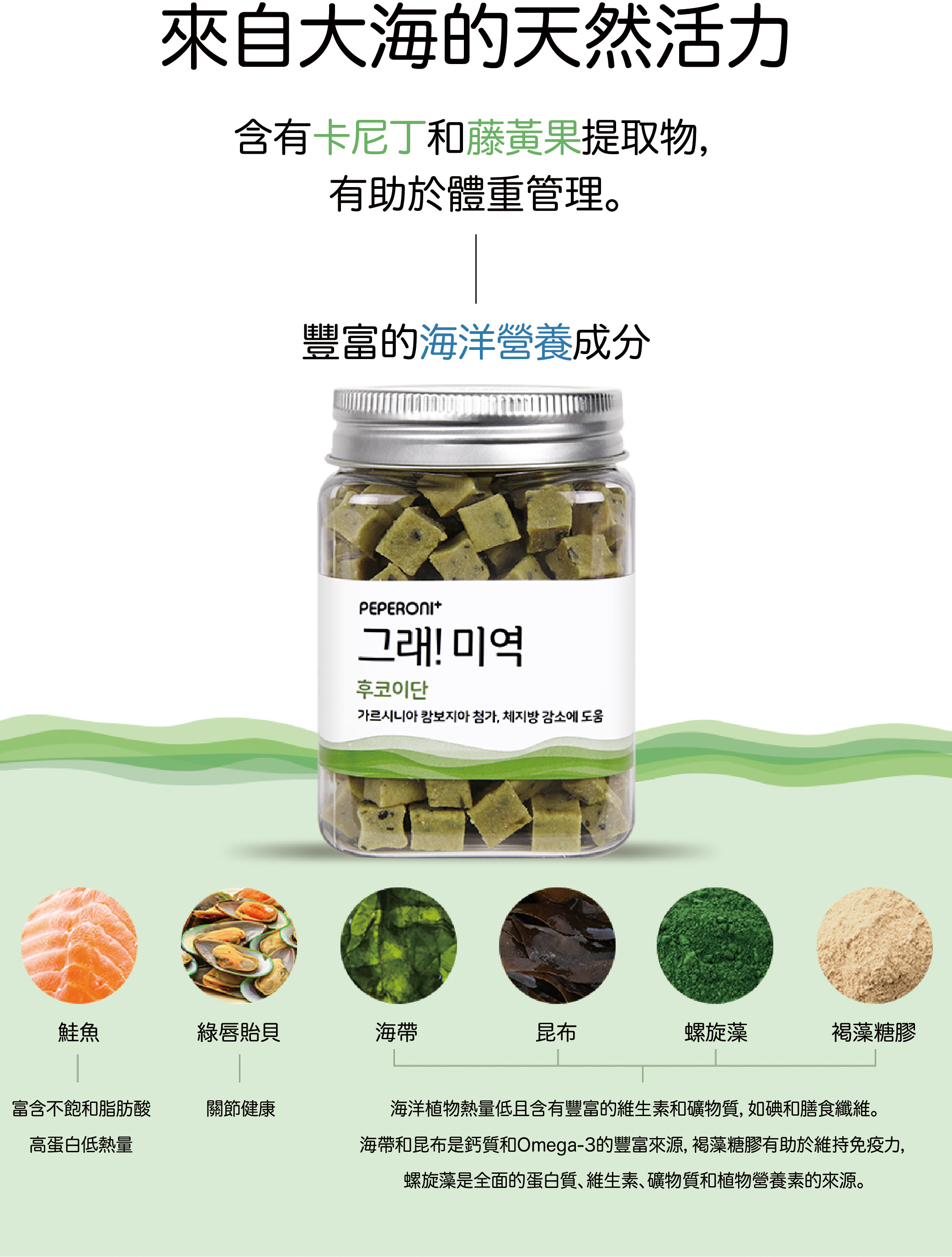採用來自大海的天然營養,補充天然維生素跟礦物質,加入卡尼丁和藤黃果,有助於減少體內脂肪。