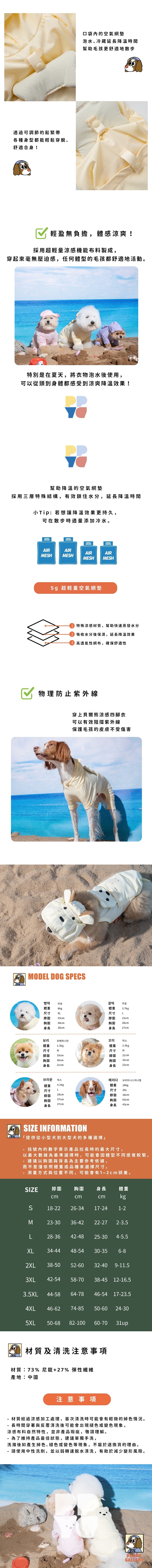 1.四腳衣設計完整包覆身體,有效隔絕蚊蟲叮咬與草地刺激