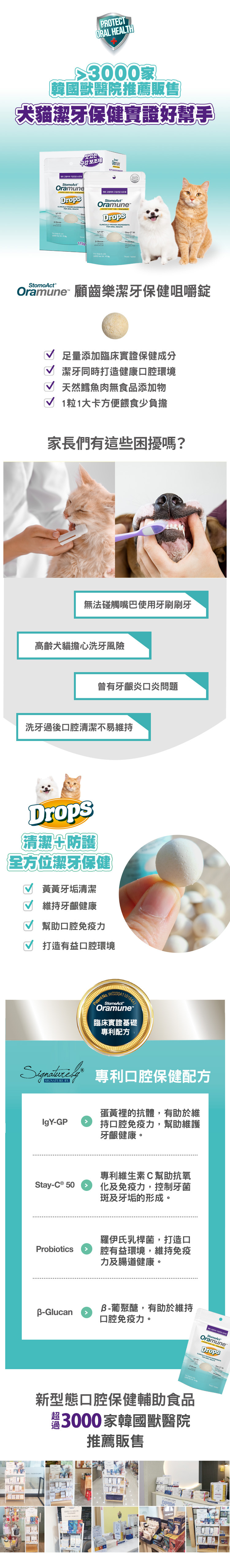 貓咪狗狗有牙結石,牙齦健康困擾,無法好好刷牙?咀嚼錠含臨床實證保健成分IgY-GP免疫抗體,可針對引起牙齦牙周問題的酵素-Gingipain作用,用吃的幫助維持牙齦健康,支持口腔免疫力。添加鱈魚肉及羊奶,如小零食般的脆脆口感,適口性佳,足量添加犬貓臨床實證的口腔保健成分,專利配方,可以幫助潔牙,同時維護口腔健康。
